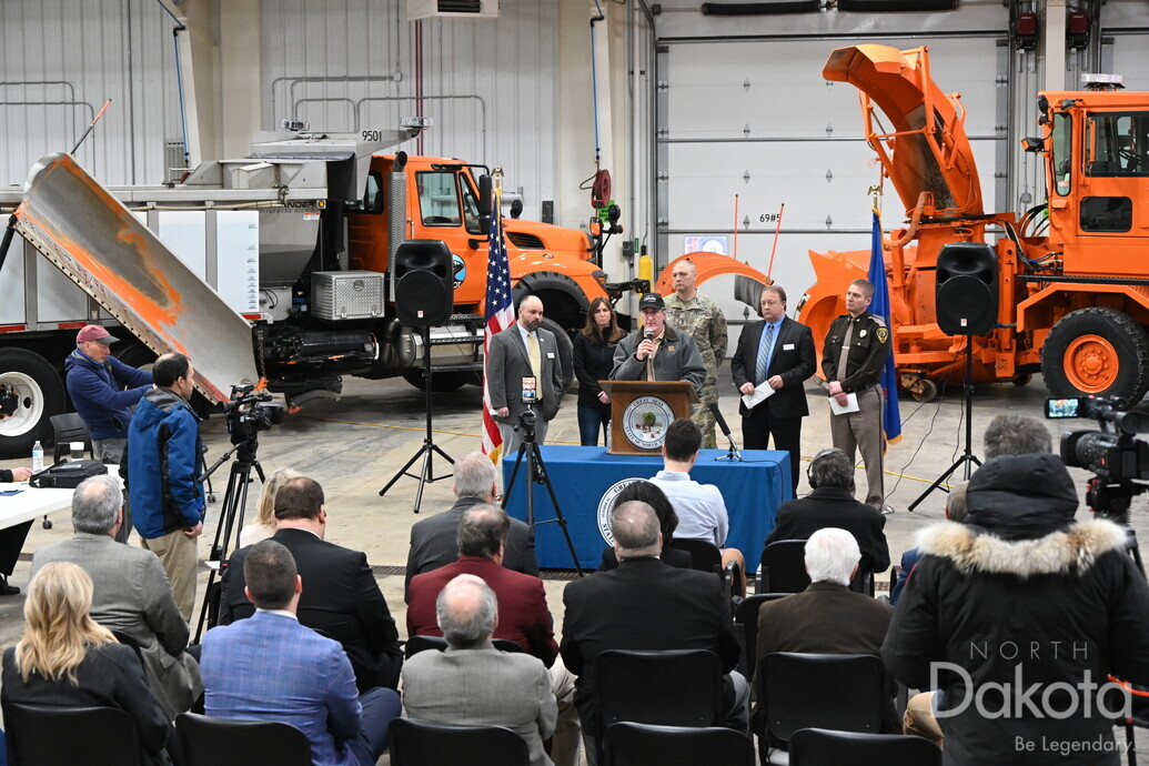 Governor Doug Burgum with NDDOT Director Ron Henke , HP Colonel Brandon Solberg, Adjutant General Major General Alan Dohrmann on the NDNG, Water Resources Director Dr Andrea Travnicek and Darin Hanson from NDDES speak at the citizens of ND about winter weather and flood preparedness