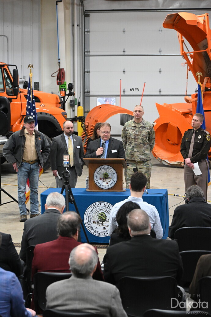 Governor Doug Burgum with NDDOT Director Ron Henke , HP Colonel Brandon Solberg, Adjutant General Major General Alan Dohrmann on the NDNG, Water Resources Director Dr Andrea Travnicek and Darin Hanson from NDDES speak at the citizens of ND about winter weather and flood preparedness