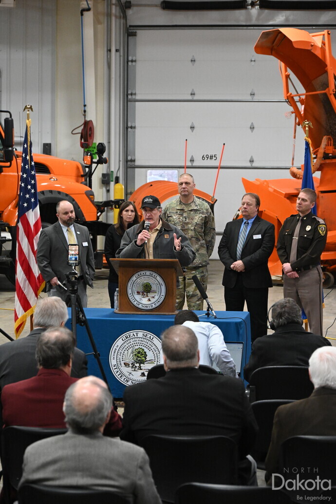 Governor Doug Burgum with NDDOT Director Ron Henke , HP Colonel Brandon Solberg, Adjutant General Major General Alan Dohrmann on the NDNG, Water Resources Director Dr Andrea Travnicek and Darin Hanson from NDDES speak at the citizens of ND about winter weather and flood preparedness