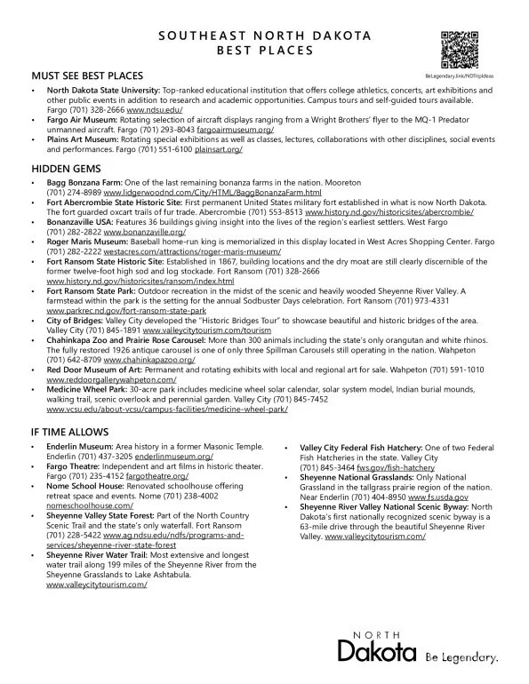 suggested itineraries, printable black and white document, best places, hidden gems, must see places, attractions, regions, North Dakota, tourism, travel, road trips, trip ideas, southeast, Fargo, Cooperstown, Mooreton, West Fargo, Fort Ransom, Valley City, Wahpeton, Enderlin,