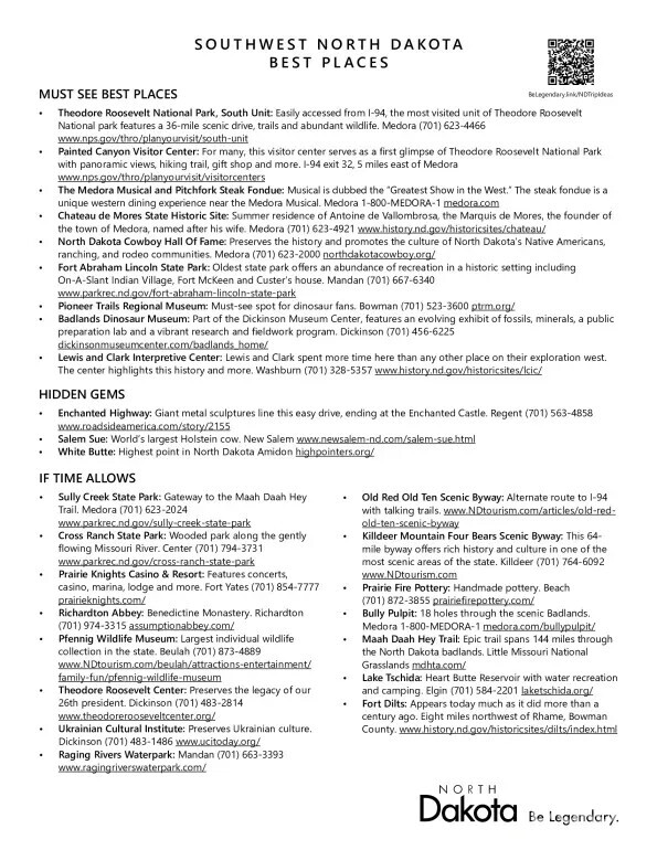 suggested itineraries, printable black and white document, best places, hidden gems, must see places, attractions, regions, North Dakota, tourism, travel, road trips, trip ideas, southwest, Medora, Dickinson, Mandan, Fort Yates, Beulah, Elgin, Washburn,