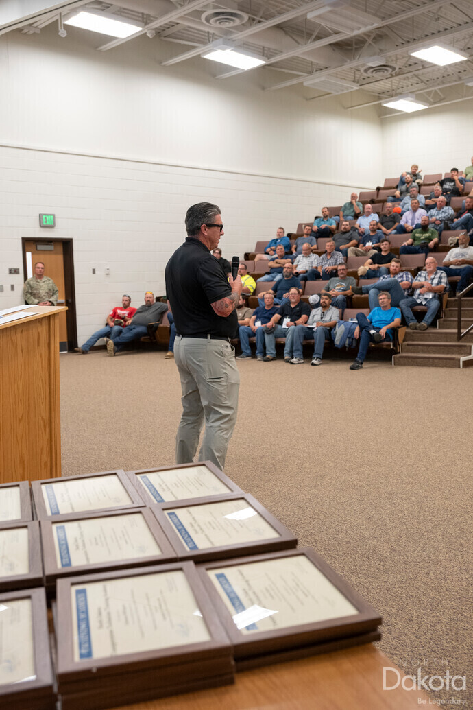 Description: | Graduation ceremony for the 20th Anniversary of the North Dakota Equipment Operations Training Academy held at Camp Grafton. The Maintenance Academy brings new equipment operators and Transportation Technicians from around the state together for a week of both classroom and hands on on training of various maintenance skills. |