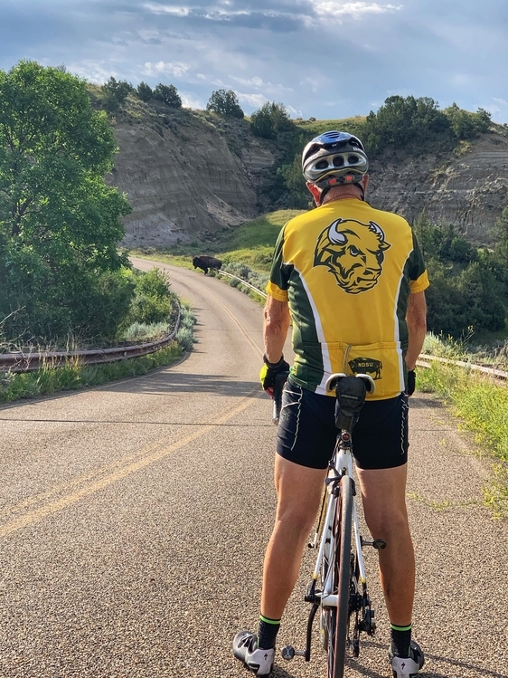 | Description: | This fun image showcases a bike rider wearing a NDSU Bison jersey pausing on along the road in Theodore Roosevelt National Park as a bison starts to cross the road in the distance. Honorable mention in the Roadtrips category. Winning images from the 2020 Governor's Photo Contest. Contest rules state: By entering the contest, photographers agree that if their photo is selected, they agree to grant the North Dakota Department of Commerce, its affiliates and AAA royalty-free rights and license to use, copy, publicly display, publish or distribute images offline and online. Credit will be given to the photographer of the image, as space allows. |